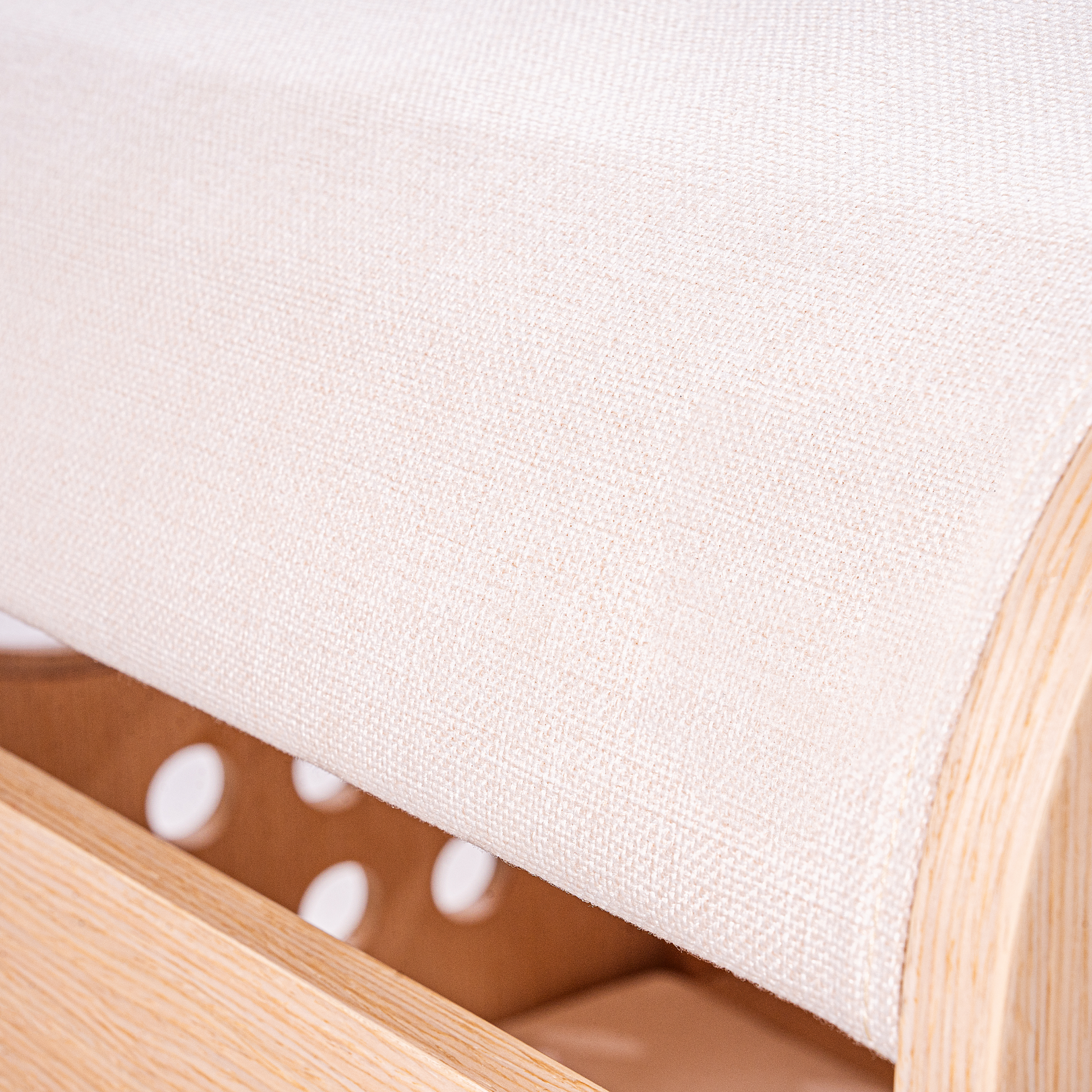 The fabric panels are removable and washable, and the wooden surfaces can be wiped clean with a damp cloth.